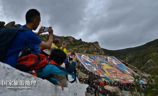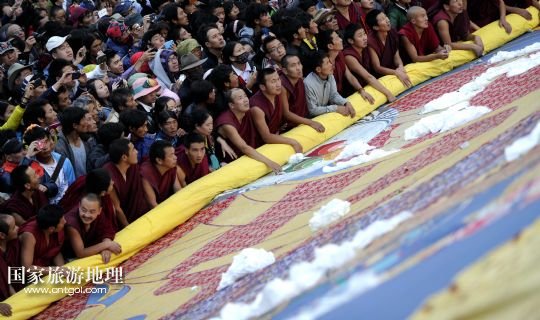 國(guó)家旅游地理 西藏拉薩8月6日訊 8月6日,拉薩哲蚌寺舉行展佛儀式。當(dāng)日,以西藏最大的格魯派寺廟哲蚌寺展佛為開(kāi)端的雪頓節(jié)在拉薩拉開(kāi)序幕。每年藏歷六月底七月初是西藏傳統(tǒng)的節(jié)日“雪頓節(jié)”。在藏語(yǔ)中,“雪”是酸奶子的意思,“頓”是“吃”“宴”的意思,“雪頓節(jié)”按藏語(yǔ)解釋就是吃酸奶子的節(jié)日,因此又叫“酸奶節(jié)”。因?yàn)?ldquo;雪頓節(jié)”期間有隆重?zé)崃业牟貞蜓莩龊鸵?guī)模盛大的曬佛儀式,所以有人也稱(chēng)之為“藏戲節(jié)”“曬佛節(jié)”。 /新華社記者 普布扎西攝
