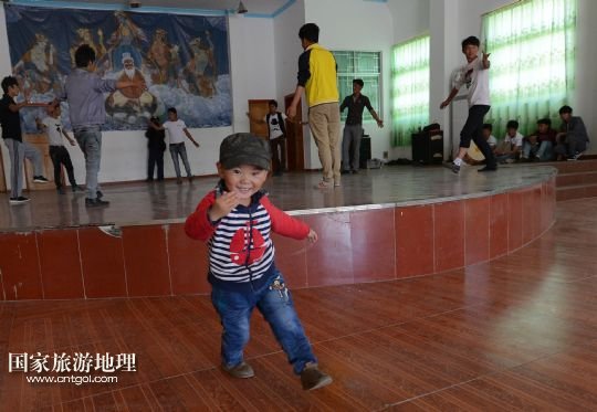 8月6日,在西藏堆龍德慶縣乃瓊鎮(zhèn)甲熱村,覺木隆藏戲團團長瓊達的孫子丹增覺美(前)模仿臺上排練演員們的動作。