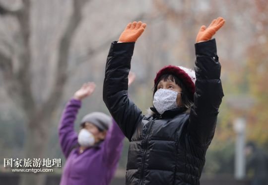 12月26日,幾名老人在霧霾籠罩下的上?;春9珗@晨練。
