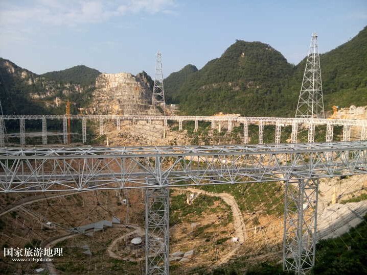 這是黔南平塘縣正在建設(shè)的大射電望遠(yuǎn)鏡,也稱 FAST,預(yù)計(jì)將于明年九月建成。FAST具有中國(guó)獨(dú)立自主知識(shí)產(chǎn)權(quán),是世界上正在建造及計(jì)劃中的口徑最大、最具威力的單天線射電望遠(yuǎn)鏡,其設(shè)計(jì)綜合體現(xiàn)了我國(guó)高技術(shù)創(chuàng)新能力。500米口徑球面射電望遠(yuǎn)鏡是利用貴州喀斯特地區(qū)的洼坑作為望遠(yuǎn)鏡臺(tái)址,建造世界第一大單口徑射電望遠(yuǎn)鏡,其擁有30個(gè)標(biāo)準(zhǔn)足球場(chǎng)大的接收面積。FAST作為世界最大的單口徑望遠(yuǎn)鏡,將在未來(lái)20至30年保持世界一流地位。